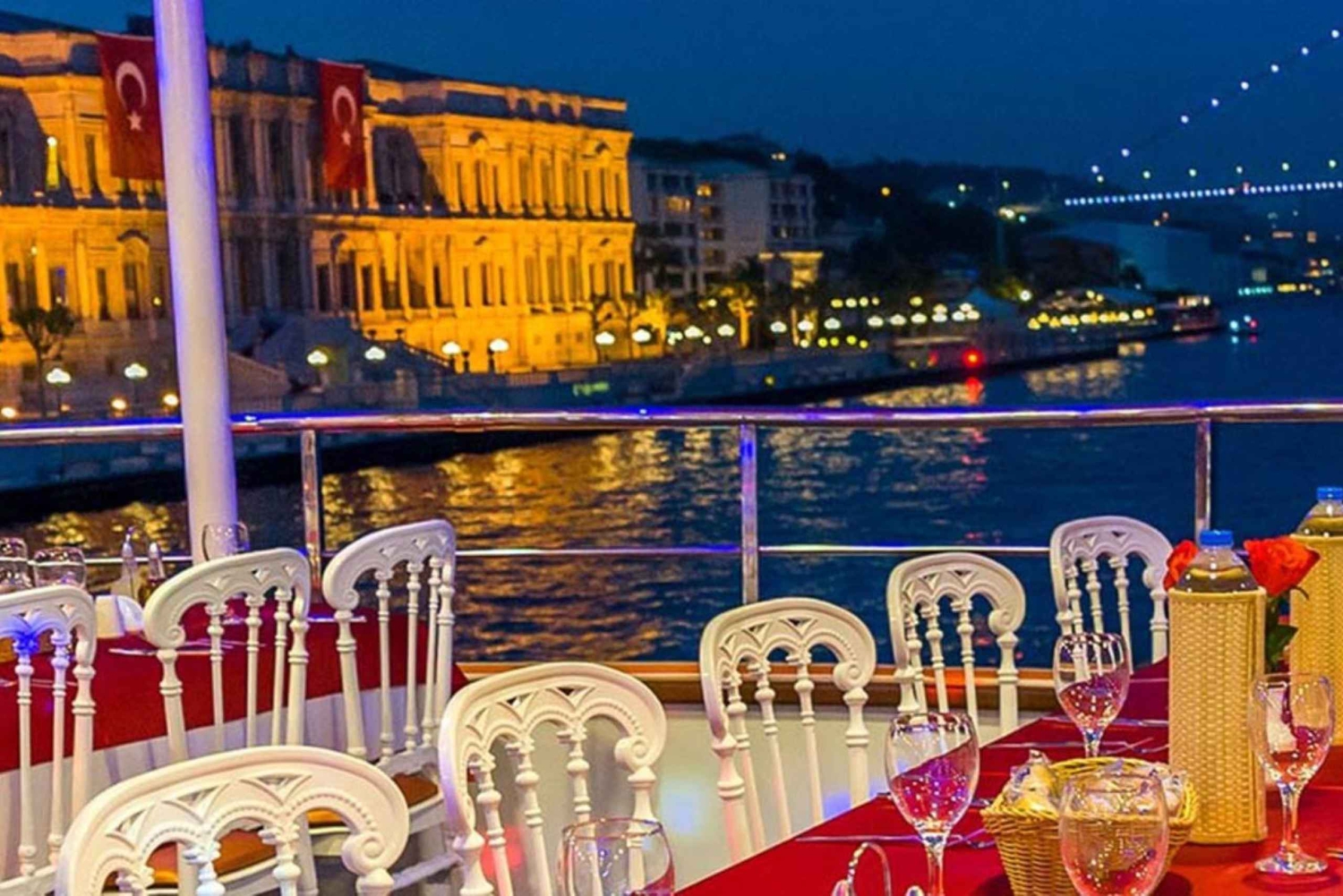 Embark on a delightful evening dinner cruise on the Bosphorus, where you'll enjoy a delicious traditional Turkish meal while watching a vibrant folklore and belly dance performance. As you sail between the European and Asian sides of Istanbul, take in the stunning views of the city's skyline and iconic landmarks. Your experience begins with a convenient pick-up from your hotel, where you'll be transported to the departure point. Set sail on a spacious, multi-decked boat equipped with all amenities, ensuring a luxurious journey. As the boat glides along the Bosphorus, you'll be captivated by the shimmering city lights, offering the perfect opportunity for unforgettable photos of Istanbul's breathtaking skyline and famous landmarks. Indulge in a mouthwatering traditional Turkish dinner while savoring authentic flavors, all while cruising through the Bosphorus. To enhance your evening, enjoy an authentic Turkish night show featuring professional belly dancers and folklore performances, accompanied by live music. The colorful costumes, dramatic lighting, and enchanting atmosphere will create an extraordinary experience. Join in the fun on the dance floor or simply relax on the deck, taking in the cool evening breeze and the stars above. After a 3-hour cruise, the boat will return to the harbor, and a car will take you back to your hotel. Experience the magic of Istanbul by night with this unforgettable dinner cruise, filled with culture, music, and delicious cuisine. Enjoy a Bosphorus dinner cruise with live folklore, belly dance, and a traditional Turkish meal. Sail past Istanbul's iconic landmarks for a magical evening with stunning views and entertainment.Includes